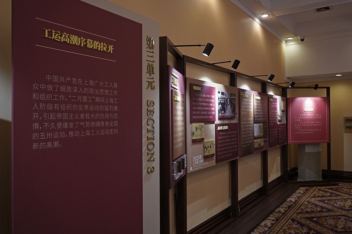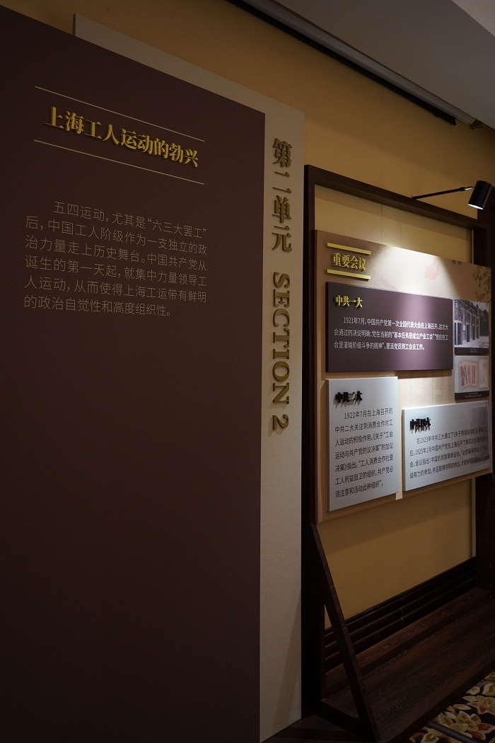五四运动,尤其是“六三大罢工”后,中国工人阶级作为一支独立的政治力量走上历史舞台,中国共产党从诞生的第一天起,就集中力量领导工人运动,从而使得上海工运带有前所未有的鲜明的政治自觉性和高度组织性,并取得很大的胜利。在该展区,观众可以看到日本资本家剥削上海工人的实物展品,感受早期上海工人的屈辱与不甘。