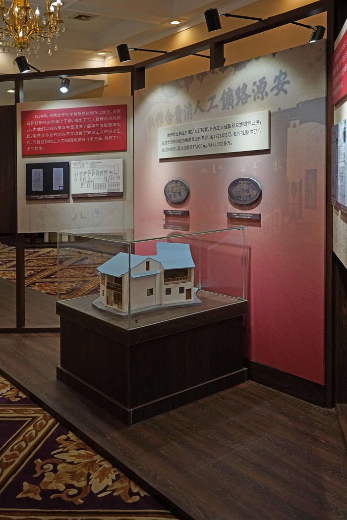 革命事业的兴起和发展,离不开经济的支撑,安源是中国共产党早期革命活动经费的重要储备点,安源路矿工人俱乐部下辖的安源路矿工人消费合作社是中国共产党领导下的第一批股份制合作经济组织,它的创办和发展,对改善工人的经济生活、团结工人坚持斗争、互济工友和为革命活动提供资金、训练工人管理经济的能力发挥了积极作用,开创了中国共产党的经济事业和金融事业的历史先河。在该展区,观众可以看到安源路矿工人消费合作社原状模型与第一张红色股票等展品,了解股票诞生背后的故事。